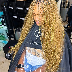 Bohemian Knotless Braids are lightweight knotless braids with soft curly strands throughout for a full, textured look. This protective style offers movement, volume, and a beautiful bohemian finish while remaining gentle on your natural hair.
